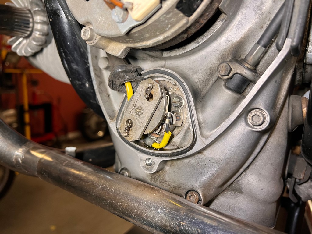 Lastly, the nut that holds the mechanical advance on the tip of the camshaft has been overtightened at some point and the tip of the camshaft was snapped off. This was repaired by peening the remaining tip to hold on the advance unit. The points can be adjusted / serviced and replaced and the advance unit can be serviced in this configuration but the advance unit can no longer be removed. This was apparently done at some point in the 1990’s and the bike has been running problem-free since.