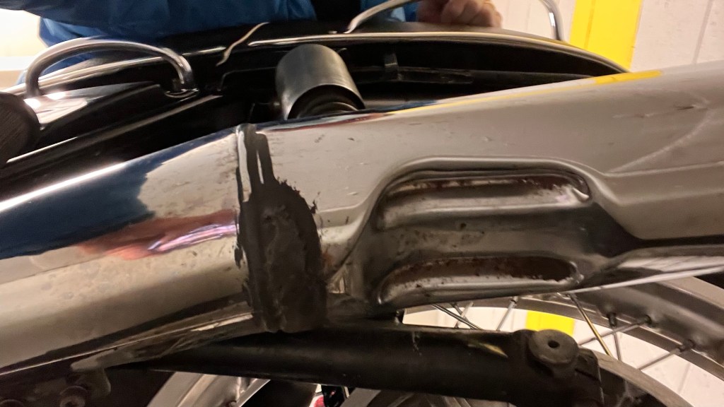 Other issues with the bike include the rear wheel splines have been replaced (they look brand new). The spline cup was bolted back on the rear wheel instead of the factory rivets. The job was done properly and is a non-issue in my book. The left hand side silencer had rusted through in one spot (at the seam) and has been ground down and re-welded. One cannot appreciate the repair unless one is laying down under the bike